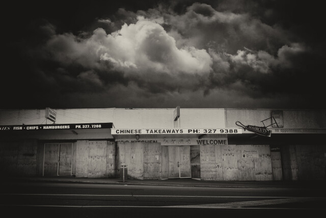 Forboding clouds lurk ominously, belying the fate damaged shops awaiting demolition, after earthquake damage, Kaiapoi main street.