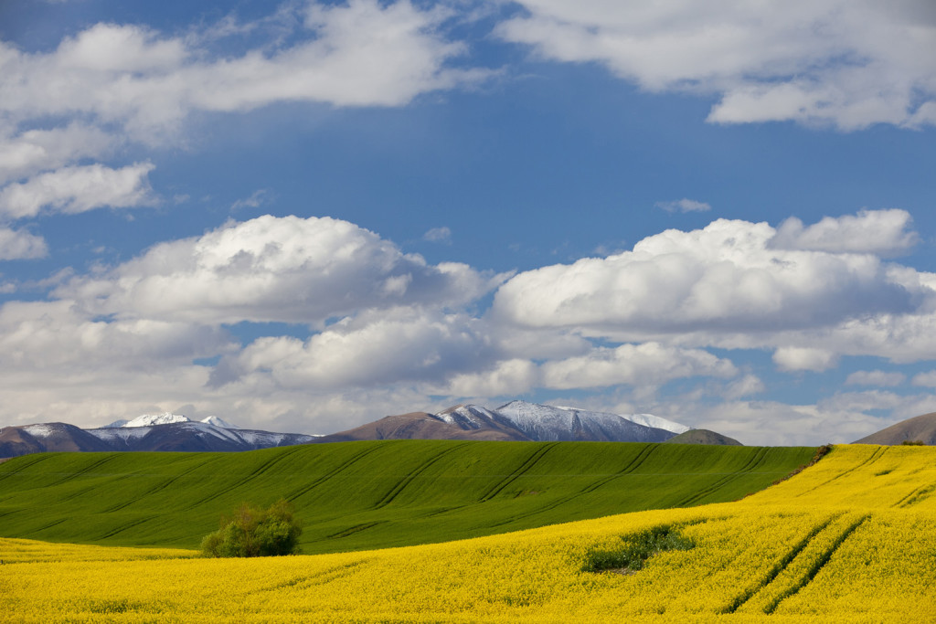 Crop fields punch through with bright colour, rural Fairlie.