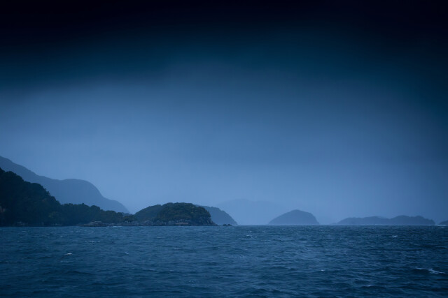 Storm brews at sea, looking back at headlands in Fiordland