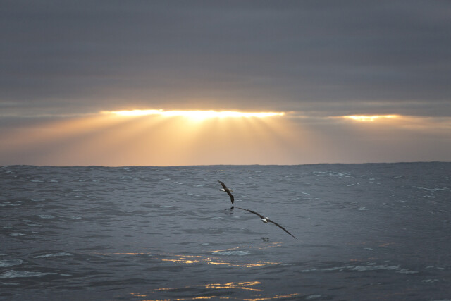 Albatross flies out at sea on dusk, Fiordland.