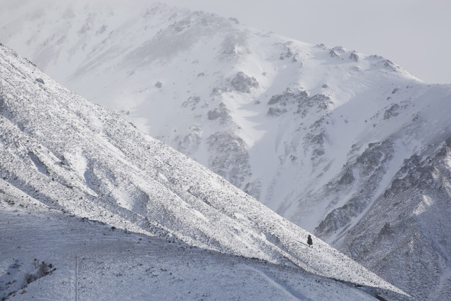Lone pine set amongst the snowy hills of Hakatere Conservation Reserve.