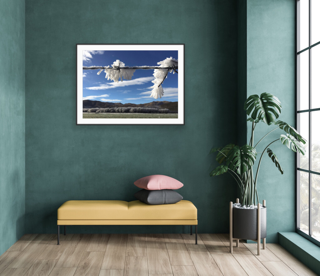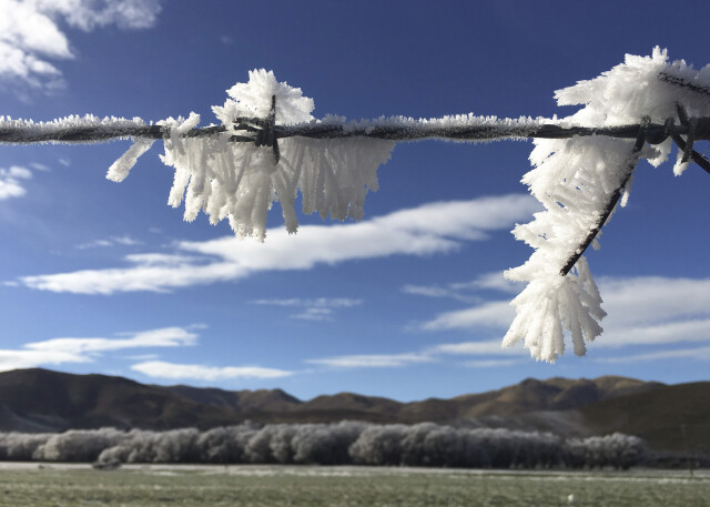 Hoar frost grips to barbed wire, Mackenzie Country winter.