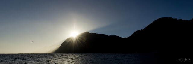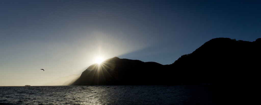 Sun dawns on Dusky Sound entrance, Fiordland.