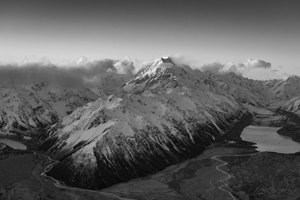 Mueller & Tasman lakes flanking Mt Cook at dusk.